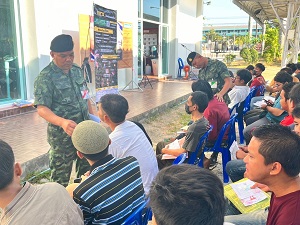 เมื่อวันที่ 7 เมษายน 2567 เวลา 07.00 น. ที่บริเวณหอประชุมอำเภอระแงะ ตำบลตันหยงมัส อำเภอระแงะ จังหวัดนราธิวาส พันโท สุกฤษฐ์ กาญจนคลอด ผู้บังคับกองพันทหารราบที่ 2 กรมทหารราบที่ 153 / ประธานคณะกรรมการตรวจเลือกฯ จังหวัดนราธิวาส คณะที่ 2 พร้อมด้วย ร้อยตรี เอกชัย เพชรด้วง นายทหารกิจการพลเรือน / หัวหน้าชุดปฏิบัติการพลเรือนกองพันประจำอำเภอ ของหน่วย เข้าพบปะและประชาสัมพันธ์สร้างการรับรู้และการสร้างแรงบันดาลใจ เชิญชวนน้อง ๆ ทหารกองเกินที่มาเข้ารับการตรวจเลือกเป็นทหารกองประจำการ ประจำปี 2567 สมัครใจเป็นทหารกองประจำการ โดยอธิบายสิทธิประโยชน์ในการรับราชการทหาร เผยแพร่วีดีทัศน์เกี่ยวกับสิทธิและประโยชน์ของการรับราชการทหาร, แจกแผ่นพับให้ความรู้เกี่ยวกับการรับราชการทหาร, ข้อดีต่าง ๆ ตลอดระยะเวลาที่รับราชการเป็นทหารกองประจำการ รวมถึงการต่อยอดเป็นนักเรียนนายสิบ เพื่อให้น้อง ๆ สมัครใจมาเป็นน้องคนเล็กของกองทัพบก เพราะเราคือครอบครัวเดียวกัน