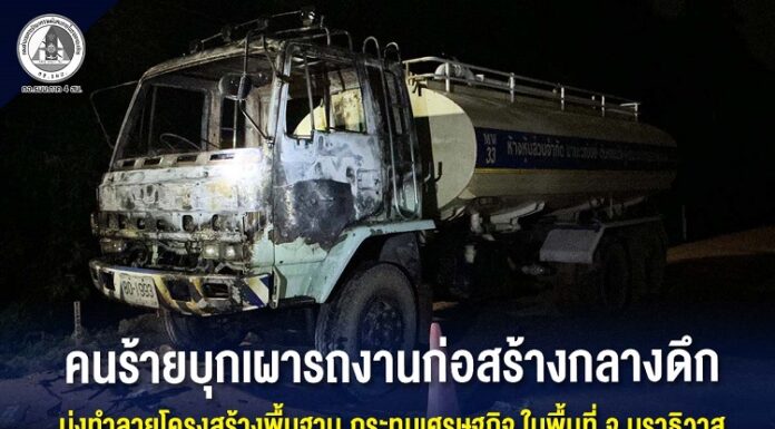 คนร้ายบุกเผารถงานก่อสร้างกลางดึก มุ่งทำลายโครงสร้างพื้นฐาน กระทบเศรษฐกิจในพื้นที่ จ.นราธิวาส
