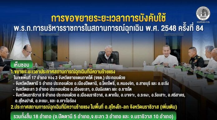 ให้ขยายระยะเวลาการประกาศจากการฉุกเฉินในพื้นที่ 17 อำเภอ ของ 3 จังหวัดชายแดนภาคใต้ ตั้งแต่ 20 เมษายน 2569 - 19 กรกฎาคม 2569...