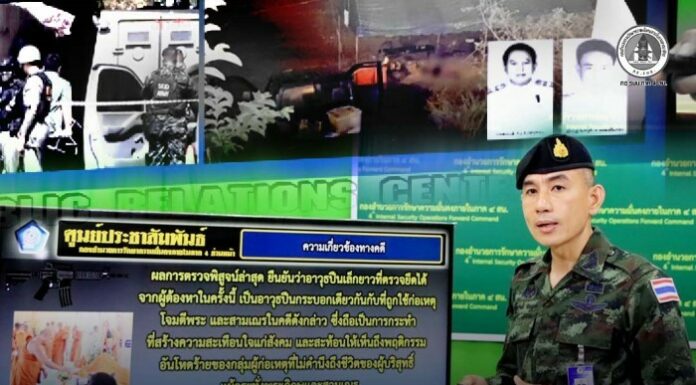 รองโฆษก กอ.รมน.ภาค 4 ส่วนหน้า แถลงชี้แจง ผลพิสูจน์หลักฐานยืนยัน ปืนที่ยึดได้จาก “มะสะกรี” เชื่อมโยงเหตุรุนแรงหลายคดีในปัตตานี–สงขลา พบใช้ก่อเหตุโจมตีพระและสามเณร จนสามเณรมรณภาพ