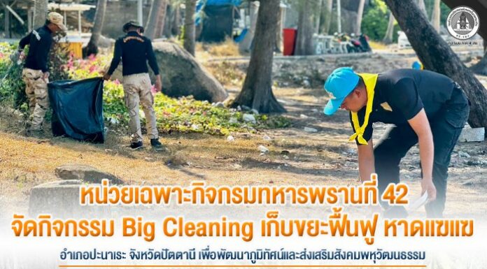 หน่วยเฉพาะกิจกรมทหารพรานที่ 42 จัดกิจกรรม Big Cleaning เก็บขยะฟื้นฟู หาดแฆแฆ อำเภอปะนาเระ จังหวัดปัตตานี เพื่อพัฒนาภูมิทัศน์และส่งเสริมสังคมพหุวัฒนธรรม
