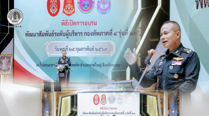 วันนี้ (25 กุมภาพันธ์ 2569) เวลา 11.30 น. ณ โรงแรมเซาท์เทอร์น แอร์พอร์ต อำเภอหาดใหญ่ จังหวัดสงขลา พลโท นรธิป โพยนอก แม่ทัพภาคที่ 4 / ผู้อำนวยการรักษาความมั่นคงภายในภาค 4 เป็นประธานในพิธีเปิดการอบรมหลักสูตร "พัฒนาสัมพันธ์ระดับผู้บริหาร กองทัพภาคที่ 4" รุ่นที่ 21 โดยมีผู้บริหารจากทั้งภาครัฐ ภาคเอกชน และภาคประชาชนในพื้นที่เข้าร่วมพิธีอย่างพร้อมเพรียง เพื่อสร้างเครือข่ายความร่วมมือที่เข้มแข็งในการสนับสนุนภารกิจด้านความมั่นคงและการพัฒนาประเทศในทุกมิติ