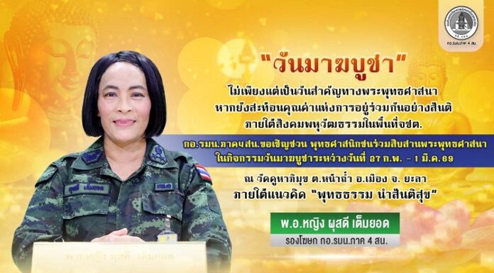 “วันมาฆบูชา” ไม่เพียงแต่เป็นวันสำคัญทางพระพุทธศาสนา หากยังสะท้อนคุณค่าแห่งการอยู่ร่วมกันอย่างสันติ ภายใต้สังคมพหุวัฒธรรมในพื้นที่ จชต. กอ.รมน.ภาค 4 สน. ขอเชิญชวนพุทธศาสนิกชนร่วมสืบสานพระพุทธศาสนา ในกิจกรรมวันมาฆบูชาระหว่างวันที่ 27 ก.พ. – 1 มี.ค.69 ณ วัดคูหาภิมุข ต.หน้าถ้ำ อ.เมือง จ.ยะลา ภายใต้แนวคิด “พุทธธรรม...
