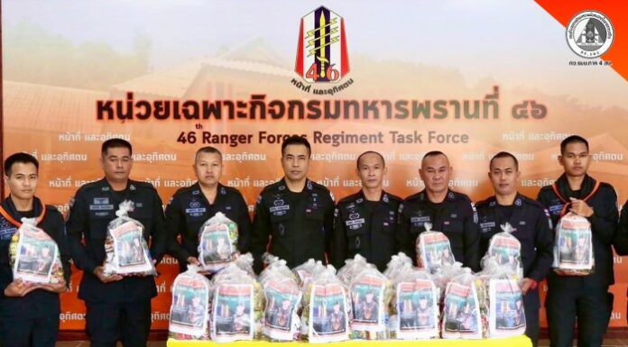 เมื่อวันที่ 9 กุมภาพันธ์ 2569 เวลา 10.00 น. ณ กองบังคับการหน่วยเฉพาะกิจกรมทหารพรานที่ 46 วัดสวนธรรม หมู่ที่ 2 ตำบลรือเสาะออก อำเภอรือเสาะ จังหวัดนราธิวาส พันเอก นพดล พรหมมาก ผู้บังคับหน่วยเฉพาะกิจกรมทหารพรานที่ 46 พร้อมด้วยรองผู้บังคับหน่วยเฉพาะกิจกรมทหารพรานที่ 46 ได้มอบถุงยังชีพให้แก่ผู้บังคับกองร้อย และกำลังพลจิตอาสาในพื้นที่อำเภอรือเสาะ จำนวน 40 ชุด เพื่อกระจายความช่วยเหลือไปยังผู้ยากไร้และผู้ป่วยติดเตียงในพื้นที่อย่างทั่วถึง