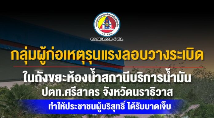 เมื่อวันที่ 10 กุมภาพันธ์ 2569 เวลาประมาณ 18.00 น. ที่ผ่านมา เกิดเหตุคนร้ายลอบวางระเบิดในถังขยะห้องน้ำสถานีบริการน้ำมัน ปตท. ในพื้นที่อำเภอศรีสาคร จังหวัดนราธิวาส แรงระเบิดส่งผลให้มีประชาชนได้รับบาดเจ็บมีอาการหูอื้อ 3 ราย ทราบชื่อคือ นางสาวรุสลีสา สะแลแม, นางสาวสารีดา สาเมาะ และ นางสาวยัสมี มานะรี ขณะนี้เจ้าหน้าที่ได้เข้าควบคุมพื้นที่เพื่อตรวจสอบจุดเกิดเหตุอย่างละเอียดแล้ว