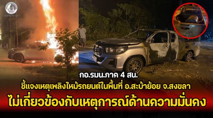 กอ.รมน.ภาค 4 สน. ชี้แจงเหตุเพลิงไหม้รถยนต์ในพื้นที่ อ.สะบ้าย้อย จ.สงขลา ไม่เกี่ยวข้องกับเหตุการณ์ด้านความมั่นคง