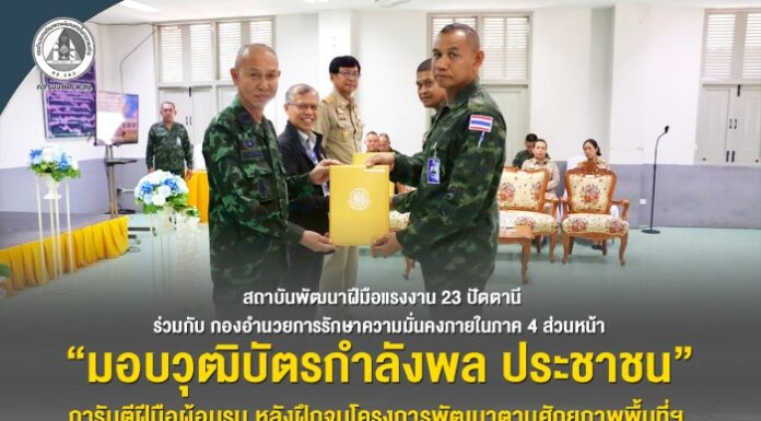 สถาบันพัฒนาฝีมือแรงงาน 23 ปัตตานี ร่วมกับ กองอำนวยการรักษาความมั่นคงภายในภาค 4 ส่วนหน้า มอบวุฒิบัตรกำลังพล ประชาชน การันตีฝีมือผู้อบรม หลังฝึกจบโครงการพัฒนาตามศักยภาพพื้นที่ฯ
