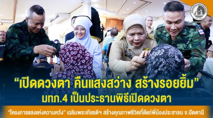 “เปิดดวงตา คืนแสงสว่าง สร้างรอยยิ้ม” มทภ.4 เป็นประธานพิธีเปิดดวงตา “โครงการแสงแห่งความหวัง” เฉลิมพระเกียรติฯ สร้างคุณภาพชีวิตที่ดีแก่พี่น้องประชาชน จ.ปัตตานี