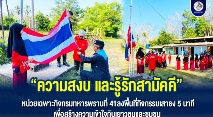 “ความสงบ และรู้รักสามัคคี” หน่วยเฉพาะกิจกรมทหารพรานที่ 41 ลงพื้นที่กิจกรรมเสาธง 5 นาที เพื่อสร้างความเข้าใจกับเยาวชนและชุมชน
