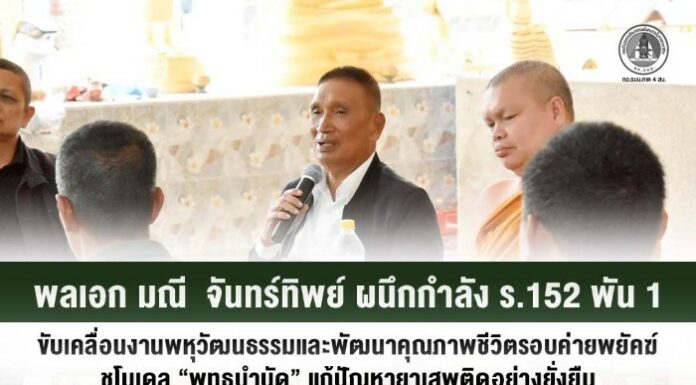 พลเอก มณี จันทร์ทิพย์ ผนึกกำลัง ร.152 พัน 1 รุกขับเคลื่อนงานพหุวัฒนธรรมและพัฒนาคุณภาพชีวิตรอบค่ายพยัคฆ์ ชูโมเดล “พุทธบำบัด” แก้ปัญหายาเสพติดอย่างยั่งยืน