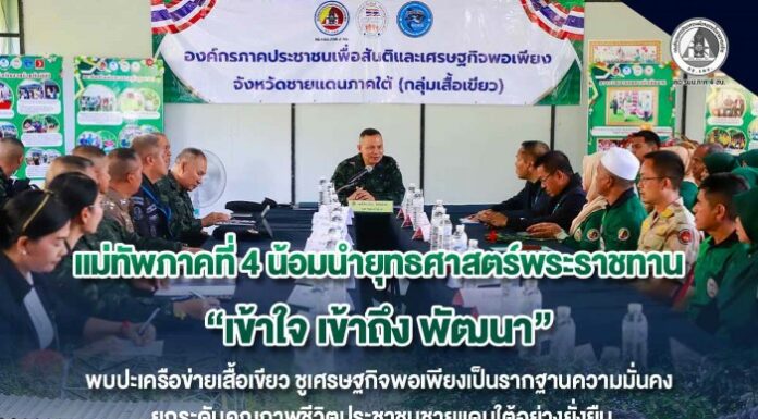 แม่ทัพภาคที่ 4 น้อมนำยุทธศาสตร์พระราชทาน “เข้าใจ เข้าถึง พัฒนา” พบปะเครือข่ายเสื้อเขียว ชูเศรษฐกิจพอเพียงเป็นรากฐานความมั่นคง ยกระดับคุณภาพชีวิตประชาชนชายแดนใต้อย่างยั่งยืน