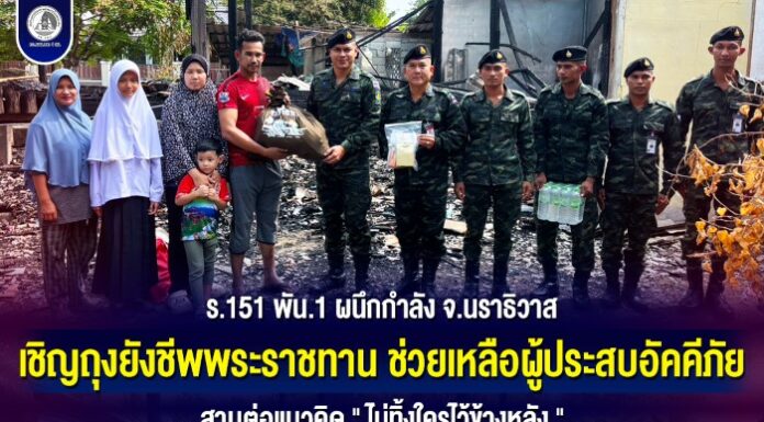ร.151 พัน.1 ผนึกกำลัง จ.นราธิวาส เชิญถุงยังชีพพระราชทาน ช่วยเหลือผู้ประสบอัคคีภัย สานต่อแนวคิด “ไม่ทิ้งใครไว้ข้างหลัง”
