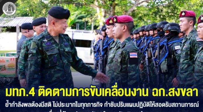 มทภ.4 ติดตามการขับเคลื่อนงาน ฉก.สงขลา ย้ำกำลังพลต้องมีสติ ไม่ประมาทในทุกภารกิจ กำชับปรับแผนปฏิบัติให้สอดรับสถานการณ์ เพื่อพี่น้องปลอดภัย นำพาสันติสุขสู่ จชต.