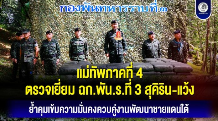 วันที่ 3 มกราคม 2569 พลโท นรธิป โพยนอก แม่ทัพภาคที่ 4 / ผู้อำนวยการรักษาความมั่นคงภายในภาค 4 พร้อมคณะผู้บังคับบัญชา ลงพื้นที่ตรวจเยี่ยมหน่วยเฉพาะกิจกองพันทหารราบที่ 3 (ฉก.พัน.ร.ที่ 3) ในพื้นที่อำเภอสุคิริน และอำเภอแว้ง จังหวัดนราธิวาส เพื่อประชุมติดตามผลการดำเนินงาน รับฟังรับปัญหาข้อขัดข้อง พร้อมมอบนโยบายและเยี่ยมสร้างขวัญกำลังใจแก่กำลังพลที่ปฏิบัติงานในพื้นที่