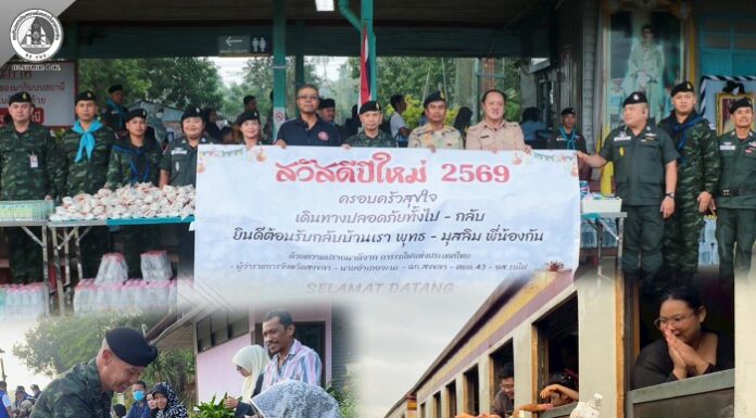 วันนี้ ( 31ธันวาคม 2568 ) เวลา 06.30 น. พลตรี ชาคริต อุจะรัตน รองแม่ทัพภาคที่ 4 /รองผู้อำนวยการรักษาความมั่นคงภายในภาค 4 ส่วนหน้า นำกำลังพลหน่วยเฉพาะกิจสงขลา 40 , หน่วยเฉพาะกิจตำรวจตระเวนชายแดนที่ 43 , ชุดสันติสุขที่ 501 ชุดควบคุมที่ 955 หน่วยเฉพาะกิจสันติสุข, ศูนย์ปฏิบัติการอำเภอจะนะ, สถานีตำรวจภูธรจะนะ และสถานีรถไฟจะนะ ลงพื้นที่เทศบาลตำบลบ้านนา อ.จะนะ จ.สงขลา เพื่อดูแลความเรียบร้อย รักษาความปลอดภัย และอํานวยความสะดวกให้แก่ประชาชนที่สัญจรกลับภูมิลำเนาด้วยรถไฟโดยสารตามตู้รถไฟ และสถานีรถไฟจุดสําคัญของพื้นที่ภาคใต้ตอนล่าง ในช่วงเทศกาลปีใหม่ 2569 พร้อมกันนี้ยังได้ส่งต่อความสุข ความอบอุ่นใจ ผ่านการมอบ "ข้าวเหนียวไก่ทอด" เมนูเรียบง่ายแต่เปี่ยมด้วยความใส่ใจ ถูกส่งมอบจากมือเจ้าหน้าที่สู่มือประชาชน พร้อมนมและน้ำดื่ม เพื่อช่วยลดภาระค่าใช้จ่ายและเป็นเสบียงระหว่างการเดินทางไกล สิ่งเหล่านี้คือสัญลักษณ์ของการดูแลกันและกันในสังคมพหุวัฒนธรรม ที่ความแตกต่างไม่ได้เป็นอุปสรรคต่อการส่งมอบความปรารถนาดี “เพื่อให้ทุกการเดินทางเปี่ยมไปด้วยความปลอดภัย”