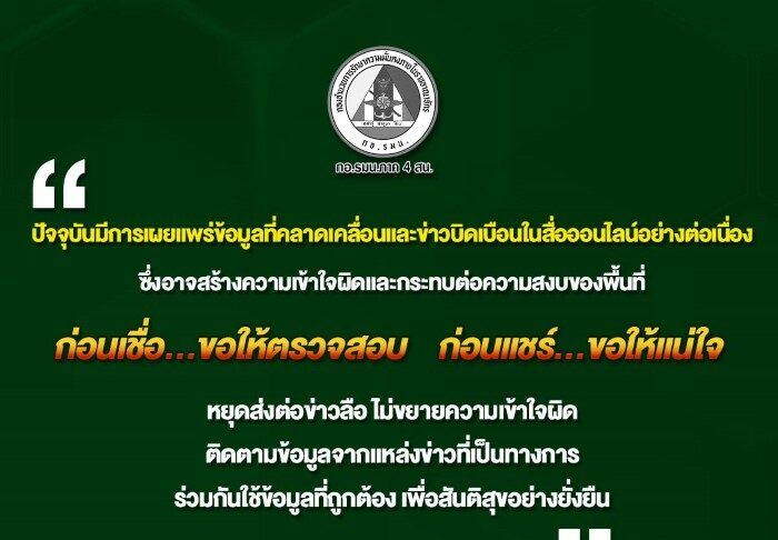 ล่าสุดวันนี้ (20 เมษายน 2569 ) พันเอก เอกวริทธิ์ ชอบชูผล รองโฆษก กองอำนวยการรักษาความมั่นคงภายในภาค 4 ส่วนหน้า เปิดเผยว่า ข้อมูลดังกล่าวเป็นข่าวปลอม (Fake News)...