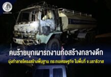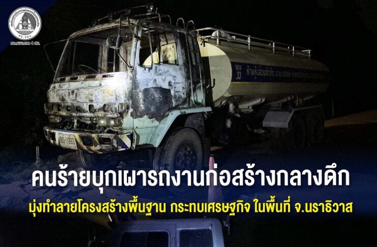 คนร้ายบุกเผารถงานก่อสร้างกลางดึก มุ่งทำลายโครงสร้างพื้นฐาน กระทบเศรษฐกิจในพื้นที่ จ.นราธิวาส